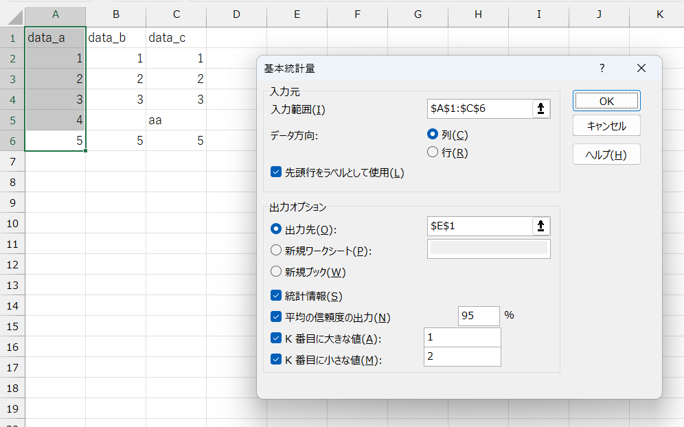 • 入力範囲(I): 基本統計量を出力したいデータの範囲を選択します。適切にデータが入力・配置されているのであれば、一度に複数の変数(列)を指定して、複数の基本統計量を出力することもできます。