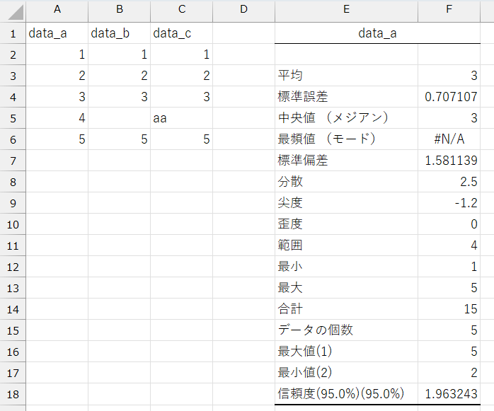 「data_a」については、Excelでは次のように表示されます。