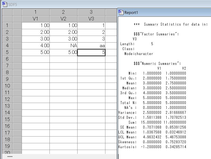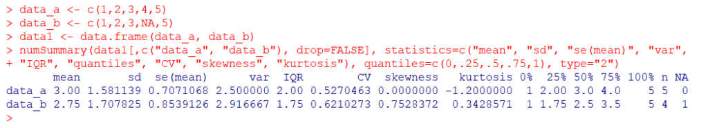 R Commander(Rcmdr)パッケージでは、data_a、data_bを「data1」というデータセットとして、numSummaryコマンドで左から順に、単純平均値、不偏標準偏差、標準誤差、不偏分散、四分位範囲(第三四分位数 - 第一四分位数)、変動係数(不偏標準偏差 ÷ 単純平均値)、歪度、尖度(*Type2)、0パーセンタイル(最小値)、25パーセンタイル、50パーセンタイル(中央値)、75パーセンタイル、100パーセンタイル(最大値)、データの個数、欠損値の個数を出力しています。