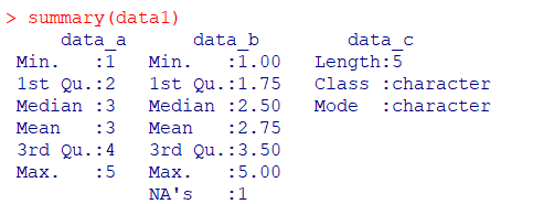 R ではdata_a、data_b、data_cを「data1」というデータセットとして、summaryコマンドで左から順に、最小値、第一四分位数、中央値、単純平均値、第三四分位数、最大値、欠損値の個数を出力しています。